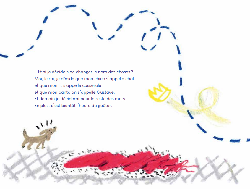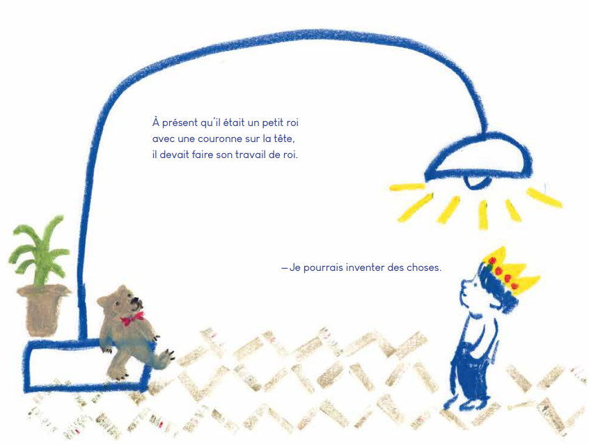 Un petit enfant s’est fabriqué une couronne. A présent qu’il est un roi (autoproclamé, certes, mais un roi), il doit faire son travail de roi. « Je pourrais inventer des choses », dit-il à Nours. Mais tout a déjà été inventé. Tout a déjà un nom. Commander ? Décider pour les autres ? Nours réprouve, visiblement. Et si l’imagination était le plus beau, le plus doux des pouvoirs ?